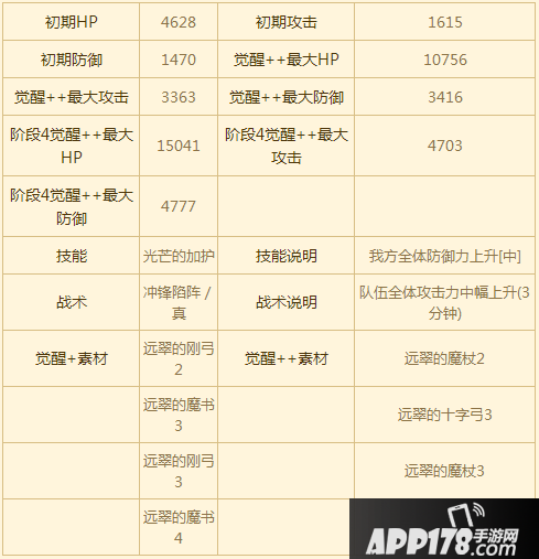 在远属性角色中拥有最高的防御力,角色技能为全体防御力UP,但是攻击力也是远属性角色中最低的,属于远属性角色中偏耐久性。相比角色技能,团战战术技能为3分钟全体攻击力UP,保值性更强。对攻城手而言是很好的角色。