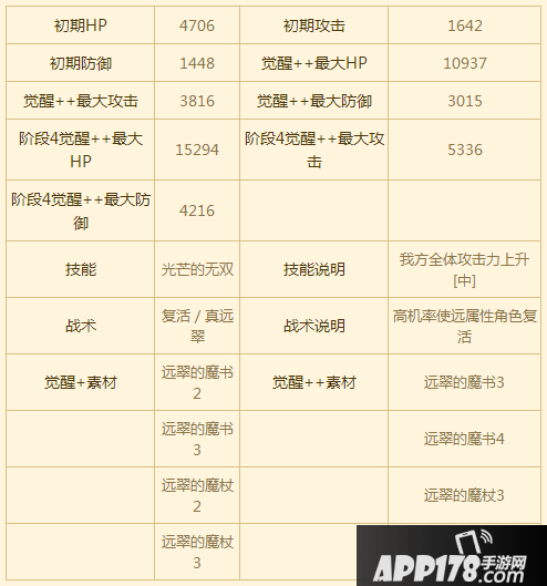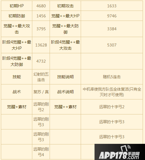 技能是随机的五连击,因为没有限定范围,可以依不同情况发挥不同的功效,其技能是会随攻击力提升的,可以使用一些增加攻击力的BUFF,效果更好,十分适合推图打任务。缺点是防御跟血量很少,要避免被攻击。团战技能为全灭时中机率使我方全体复活,在实用性上较为一般。