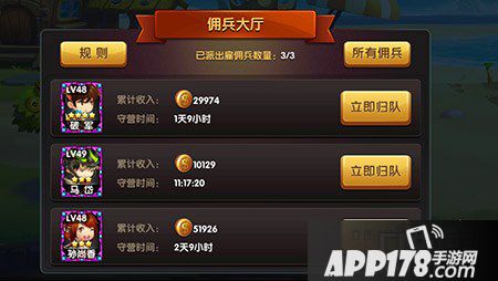 这个有点儿隐蔽,在军团界面中。点击佣兵大厅。在这里你可以将自己的英雄放到这里时间越长收入越多,派出的英雄如果被雇佣,那个金币会得到的更多(所以一定要派出自己最好的英雄哦,因为你派出的英雄不会有任何影响什么都不消耗,何乐而不为呢)。