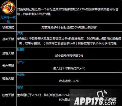 技能和天赋分析:这个武将的技能单体输出很恐怖,而且每次觉醒技能后都会增加自身攻击力,暴击概率和暴击伤害,放在前排输出再好不过,除此之外他在前排吸收伤害,当自身血量降到20%时还会触发暴怒天赋,减伤并免疫负面状态,再次提高暴击几率和暴击伤害,简直无情。