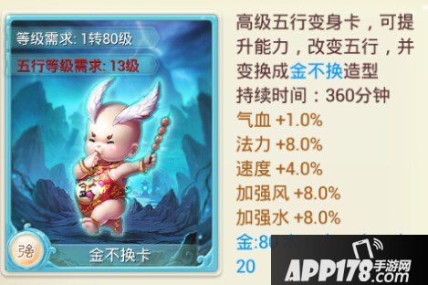 从变身卡属性我们可以看出金属性都非常的高,而由于手游存在五行修炼,所以大多数仙族会选择几张比较固定的变身卡,进行针对性的单五行修炼,来获得五行修炼加成。于是我们得到几点:
