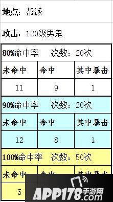 下面我们来看下另一组数据!对120级男鬼,分别是80%、90%、100%各20次,各命中情况下的攻宠攻击数据!