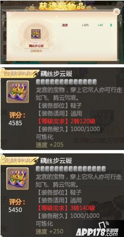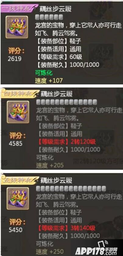 下面直接来看下一级到五级神兵数值,数值那是爆表,1级神兵OS鞋子为敏+107.4级达到205,5级直接敏+250。没打宝石的4级的数值已经超过与二阶仙器鞋子数值(二阶仙器敏鞋子没打满宝石为170)