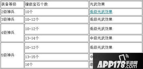 首先如何判别各级别神兵发光的颜色分几种,从大话精灵处我们得知,1级神兵不会发光,2-5级神兵镶满一定数量宝石都会有发光效果,分低级、中级、高级,详情见下表:
