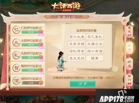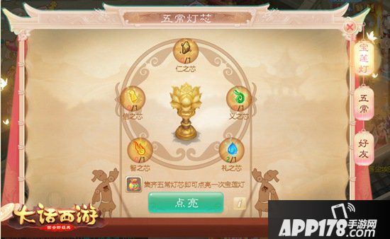 五常之道即“仁、义、礼、智、信”,是中华传统道德的精华,也是点亮宝莲灯的关键。在这次活动中,玩家只要积攒活跃度,就有机会从“仁、义、礼、智、信”之中随机获得1个五常灯芯。同时,好友也可以从这五个方向对玩家进行评价,当玩家在成功凑齐10个某方向的评价数,就能获得1个该方向的五常灯芯。