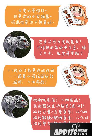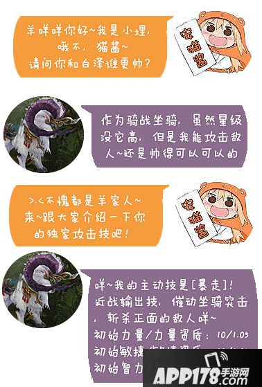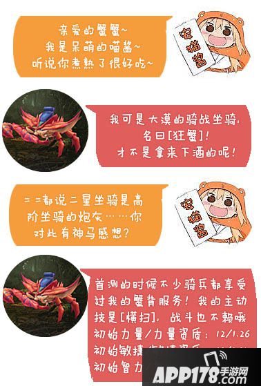 上周四的大漠爆料为大家科普了大漠食物链最底层的一星坐骑的资料,现在将循序渐进,铺垫上二星炮灰坐骑的资料……虽然是炮灰,可是他们也很努力地在首测中帮助大家作战!猫酱看到不少友友骑着山羊、蟹蟹、影狼和白虎呢!快来看看陪伴大家首测征战的二星战友们吧!猫酱坐骑访谈录,每周一、周四上线,不要错过哦!