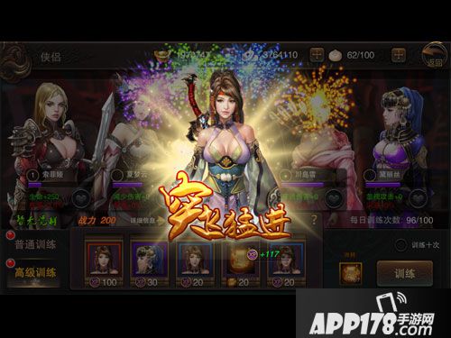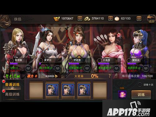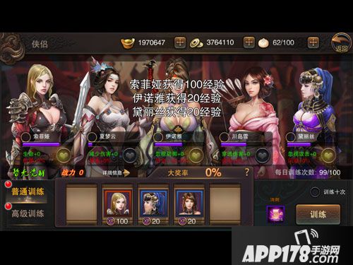 另外,点击美人身旁的“桃心按钮”,则会进行美人特训。特训时美人刷出几率增加10%。训练美人除了获得美人经验外,还会获得游戏内各种稀有道具,包括元宝在内哦!