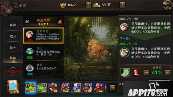 到了28级之后,传统的坐骑功能又有了新花样,坐骑天生携带的技能可以提升了。玩家可以选择所喜爱坐骑的相关技能进行升级,升级需要消耗领悟书,领悟书获得方式很多,既可以通过刷相应的战役副本,也可去角斗场获取奖励。同时为了增加领悟技能的成功率,还可以通过增加领悟丹,来提升升级的成功率。