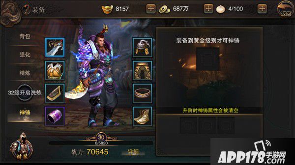 升到30级之后,装备功能又有了新玩法,那就是神铸功能,神铸可以大幅提高装备属性,但需要注意的是,只有被强化到黄金级别的装备才能被神铸,玩家需要多多强化装备。