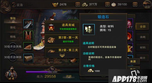 如果玩家选择了强化装备,就必须要获得大量的锻造石,而锻造石乃至游戏中所有材料的获得方法,都可以通过点击锻造石详情右下方的来源按钮来找到,方便玩家定点获得材料。