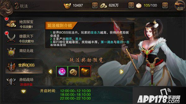 在23级,玩家就可以挑战世界BOSS了。击杀世界BOSS可以获得包括5星坐骑碎片在内诸多奖励,玩家的输出越高,相对应的奖励就越丰厚,第一个接触BOSS和对BOSS释放最后一击的玩家还会获得特殊奖励。但玩家要注意世界BOSS只在每天的12:00——12:10,18:00——18:10,22:10——22:10刷新,一旦错过就只能等改天再挑战了。