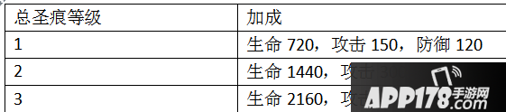 当某一颜色的符文总等级达到25、40、50级时,可以激活对应的1、2、3级圣痕,当所以符文总等级达到50、100、150级时,可以激活1、2、3级总圣痕。圣痕是有附属加成的