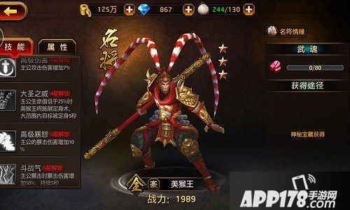 美猴王达到4星后,将解锁技能高级伤害和大圣之威。高级伤害将增加主公的攻击伤害,大圣之威则将在主公生命值低于一定程度后大范围定身敌对目标。而在美猴王达到5星时,解锁的高级暴怒技能可以继续提高主公的暴击伤害,斗战气技能则可在主公暴击时增加暴击伤害,且持续一定时间。从技能看,美猴王乃是一个攻击型名将,特别将优化主公的暴击伤害。将5星美猴王收入麾下,面对小虾米简直是一刀决胜、畅快秒杀!