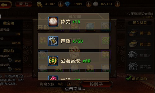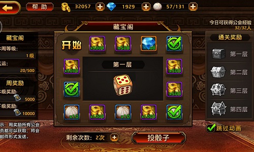 公会藏宝阁共有四层,每走完一层都可以获得公会经验、气运和大量声望作为奖励,且2、3、4层奖励分别是第一层奖励的1.5、2、2.5倍!但是,光凭借逆天的运气是走不完4层的,所以想要得到后面奖励的主公们可以花费钻石获取摇骰子的次数,赢取更多福利。当然,花钻摇骰子也有10次的上限,所以究竟能获得多少奖励,就看各位主公的运气了!