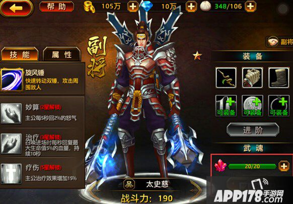 升星:武魂不仅可以合成副将,还可以用于副将升星,所以在副将合成后,不必担心剩余同种武魂会浪费。因此武魂对于副将成长来说是很重要的,所以努力去收集吧!如果不知道哪些副本会掉落想要的武魂,可以点击副将界面的“+”号查看。