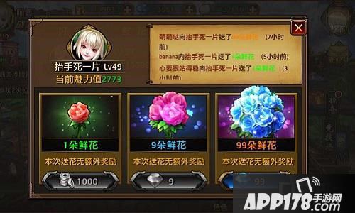 披荆斩棘的到达24级,想必各位主公已经拥有了不少好友,其中大概还有不少萌妹子,是不是很想有一种途径来大献殷勤呢?别担心,24级后就可以向心仪的对象赠送鲜花!予人玫瑰,手有余香。送花不但可以获得大量体力,还能获得可以在商店内兑换稀有物品的花瓣!不仅如此, vip7可以送土豪版的99朵鲜花,更多体力,更爽体验!嘘,一般人小编不告诉他。