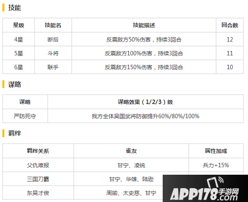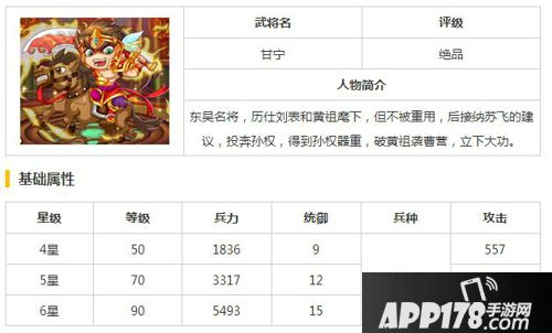 以上就是大牌三国甘宁属性图鉴的全部内容,希望能给喜欢甘宁的小伙伴们带来帮助。更多相关攻略稍后送上~请继续关注APP178手游网~更多精彩期待你的分享~