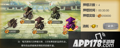 玩家在【奇遇】副本玩法中,可以通过完成龙门镖局中的押镖任务,获取大量的铜币奖励。押镖任务奖励10000铜币到200000铜币之间不等,玩家可以通过消耗元宝刷新获取更高的任务奖励。