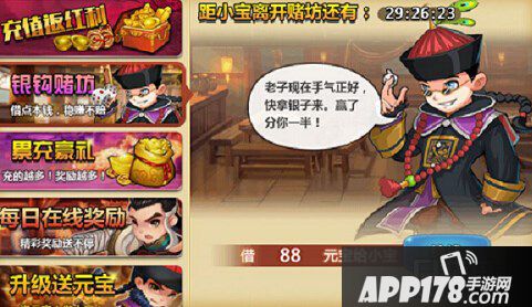 通过进入游戏的活动,可以查看到银钩赌坊。银钩赌坊是官方为感谢玩家对游戏的喜爱与支持,开服乐翻天感恩回馈的活动,投入一点本钱,稳赚不赔。在游戏内将一定数值的元宝借给小宝后,返还大量的元宝,本次活动可以参与5次,银钩赌坊是不容错过的元宝活动。