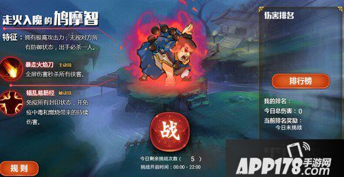 走火入魔的鸠摩智具有以下特征:具有极高的攻击力,无视所有防御状态,出手必杀一人。主动技能为暴走火焰刀,全屏伤害秒杀全体,被动技能错乱易筋经,免疫所有封印状态,免疫毒和灼烧带来的持续伤害。