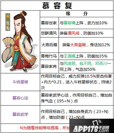 与威力无穷的大招相比,慕容复的被动技能几乎可以忽略不计,慕容心法增加自身气血,提高生存能力,慕容武学增加自身一定的武力值与内力值,提高慕容复对敌方造成的伤害值。