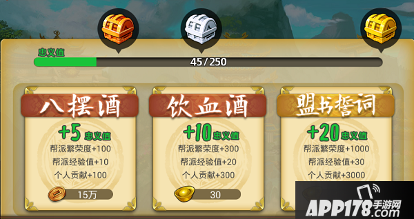 一级帮派:帮派人数上限20人,15个人捐30元宝,5个人捐298元宝,忠义值:15*10+20*5=250,而忠义值达到250点可以开第三个帮会宝箱100元宝。