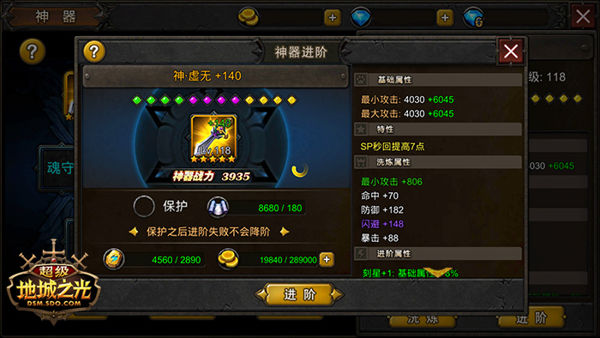 神器一共可以进阶到12级,即+12,12级里分为刻星4次、影月4次、噬日4次三种等级。前4次进阶成功为刻星,会增加神器8%至15%的基础属性;影月会增加神器10%至20%的基础属性;噬日会增加神器12%至25%的基础属性,总计12次进阶。进阶存在失败,失败后若进阶时未使用保护券,可能会导致神器退步。