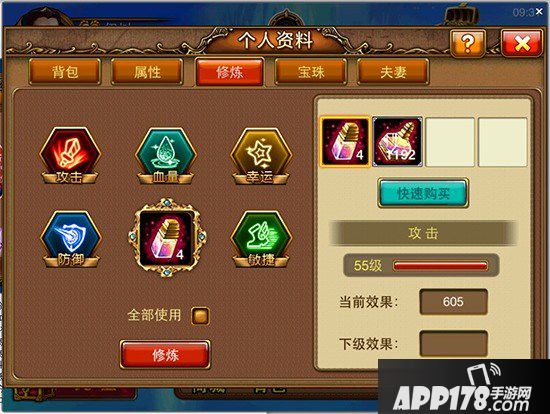 修炼系统在玩家等级达到14级后开启,点击个人资料就可以看到修炼系统,每个属性初始等级都为0级,通过使用修炼药水可以提升5种属性的其中一种属性等级。