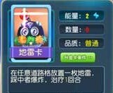 地雷卡是一张一星的卡牌,可以对道路格进行使用,可以在任一道路格中放置一枚地雷,踩中的玩家将会治疗1回合。卡片使用消耗2颗星星,点券数40,金卡点券数为2180。
