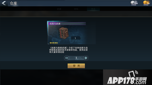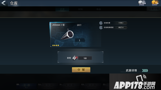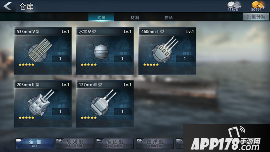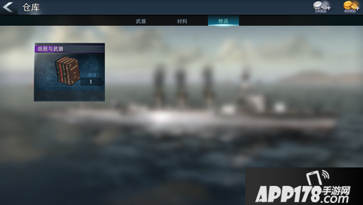 仓库分类清晰,分为武器,材料和物品。其中武器里存放的是各种战舰的战斗装备,材料里存放的是升级或者进阶的各种所需材料,物品里存放的是一些消耗品~