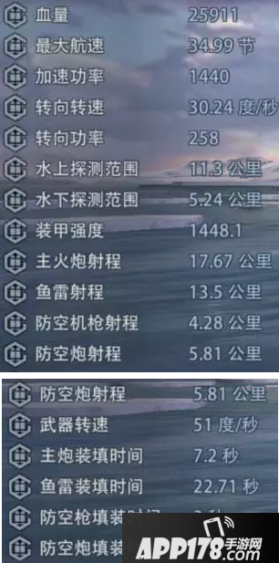 紧接着往下看,我们可以发现重庆号的射程出奇的远!在所有巡洋舰中,重庆号的射程是最远的,达到了17.67公里!如果搭配巡洋舰的第二套技能,以及涂装,再加上成员的话,可以达到22公里左右,哈哈,想想就很刺激,有没有!!!