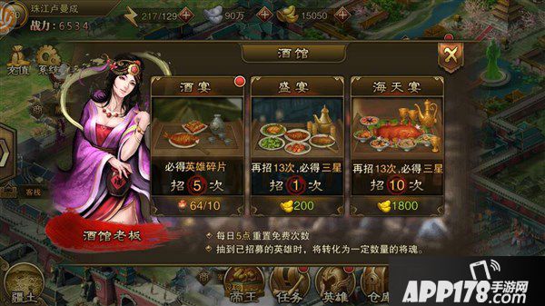 陛下进了游戏之后,最应该熟悉的地点应该是酒馆和客栈,用来招将和将魂。酒馆每天都有免费招将次数。达到一定级数之后,就可以开启客栈刷将模式,锁定你想要的武将,刷刷刷将魂滚滚来啊!