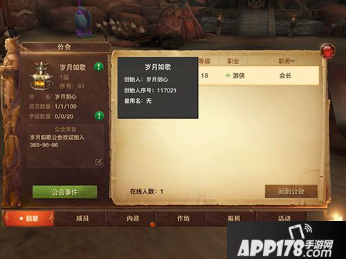公会首页会显示创始人,公会公告,成员人数,学徒人数,在线情况等信息