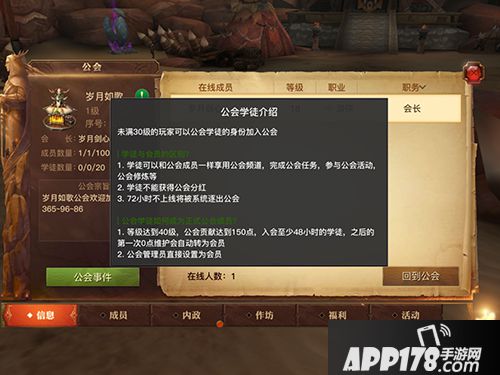 学徒系统,直接申请加入公会,默认批准为学徒,会长可以自行设定,入会时间及贡献达到要求即可转正,公会会长也可以提前将学徒任命为会员