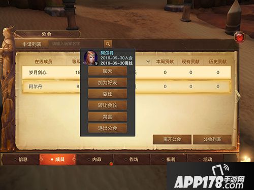 成员页面显示职业,职务,贡献等信息,点击公会列表还可以查看其它公会,公会职务授予和离开公会都在本页