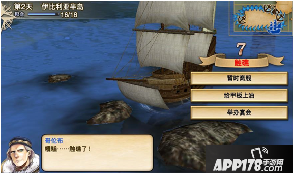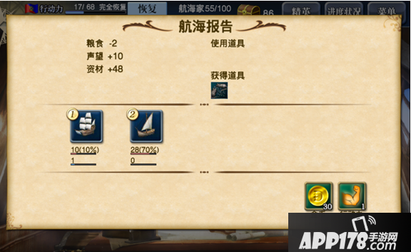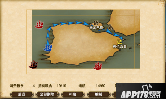 航行途中粮食用尽,将在海面停泊。停泊时,可通过【筹集】消耗行动力来补充粮食。