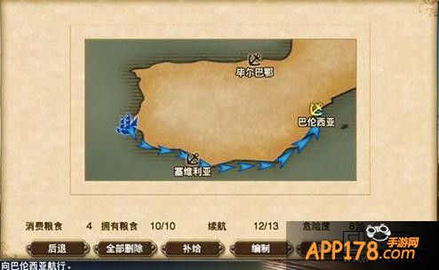 3、在设定航线界面,可以回复体力、补充食物、雇佣船员、装备物品。回复体力需要消耗“精力”。补充食物只能在城市中进行。雇佣船员只能在城市及据点中进行。装备物品可用于航海中的突发事故,能避免事故造成的损失。