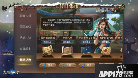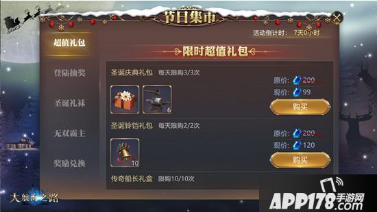 船长可以用专属的折扣价格,购买圣诞节活动专属限时减免券礼包、登陆抽奖券,获得超值游戏道具!