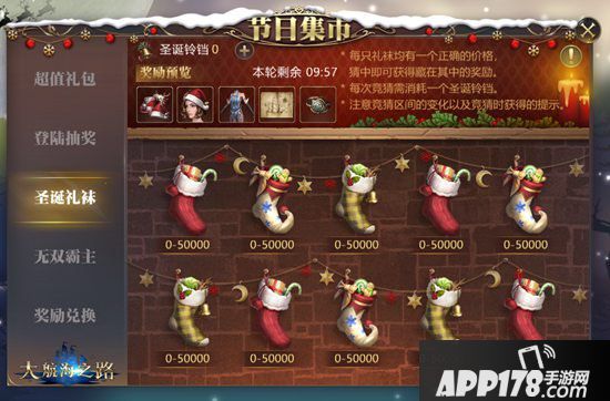 圣诞节来临,圣诞老人早已将准备好的礼物放进了圣诞礼袜当中。活动期间,船长每消耗一个圣诞铃铛即可进行一次竞猜,界面中每只礼袜均有一个正确的价格,船长们猜中即可获得藏在其中的丰厚奖励,还请多留意竞猜区间的变化以及竞猜时获得的提示哦。