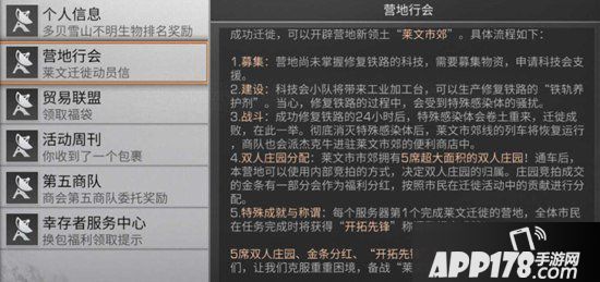 ①募集:营地内部募集(捐)指定物资 ,到一定数额,申请科技会支援,获得修复铁路的科技。