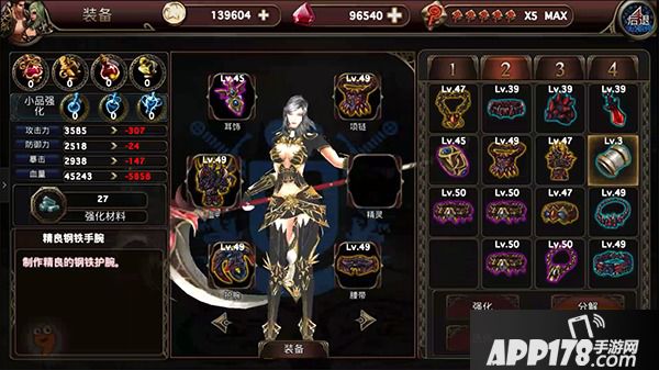 打不过该怎么办呢?除了努力的刷副本以外,另外一件事情就是提升装备啦,点开游戏右侧的装备按钮会弹出装备系统,在这里我们可以自由的替换耳饰、项鍊、盔甲、护脘与腰带,每种装备都能够进行强化、洗鍊与分解,只要持续蒐集就能够获得更强大的装备与战力喔!