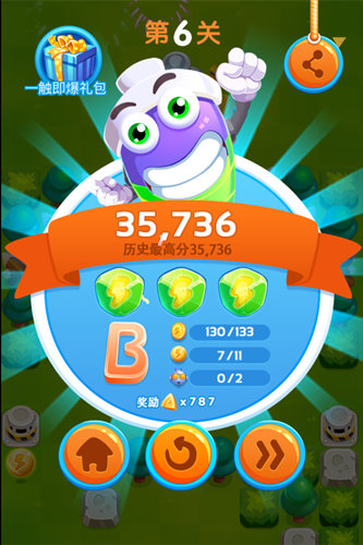 在结算界面方面,总共有133金币,11个小能量球,而怪物只有两只,分布在前面的位置,如果要获得高分的玩家,只需消耗一个打击的道具即可。