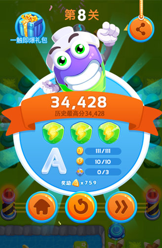 在结算界面方面,总共有111金币,10个小能量球,3只怪物,其中怪物如果不舍得用道具消除的话可以用护盾去碰触,这样即安全又能够获得高分。