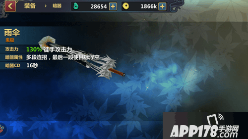 关于暗器的选择,我选择的是雨伞,配合双剑的快速攻击,可以打出更多连击伤害。雨伞跟双剑配合的话也是不错的选择(主要也是没得选。。。)。