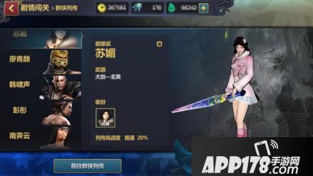 群侠是刀剑兵器谱的核心特色玩法,数十位江湖成名高手,专属武器技能,总有以为是喜欢的。苏媚是初始群侠,只要你等级达到要求开启群侠客栈就可以获得苏媚的青睐。最容易获得的一位群侠,也是最容易上手的群侠,非常适合新手作为主力来练习。