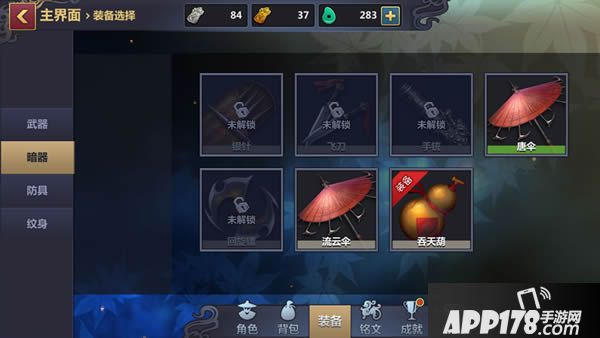 手铳:伤害爆炸,特效是额外拥有20%暴击几率,无视格挡并击飞,50段银令解锁。伤害最高的一个暗器,但是使用的前摇和后摇很大,容易被躲闪,可以用在特定的几个连招收尾。