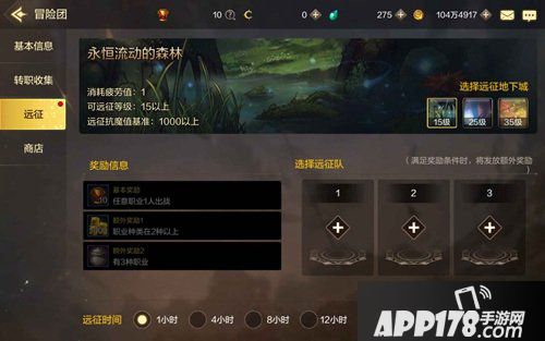 冒险团成立之后就可以去参加远征,远征里面的奖励也是比较丰富,远征结束之后能够通过不同的副本获得各种奖励。远征的副本有三个,分别是永恒流动的森林、狂信徒的痕迹和无法成为森林的地方。这三个副本都有一定的基础要求,玩家在进行远征的时候要注意副本的要求,然后再看额外奖励要求,这样才能挑选出适合远征的角色参加远征。