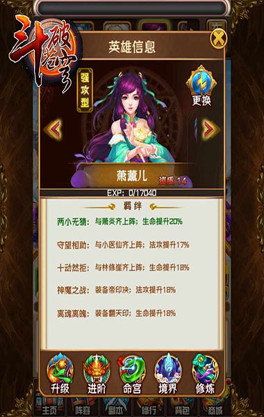 除了通过上述方式进行属性的加强,游戏也为玩家提供了其他属性提升的方式,例如英雄信息下方的进阶,玩家可通过进阶石对英雄进行进阶成长,此方法的属性加成将会得到大幅度提升;或通过命宫、境界、修炼(洗点)等方式对英雄能力进行提升。