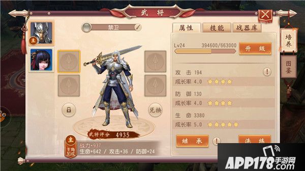 “武将”也是端游系统移植,目前看来基本是套路。可学习技能,可装备武器,可升级可洗资质,最大的作用是提高战力和单人PVE时跟随战斗。