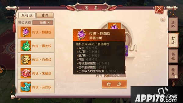 “五行纹”,可以镶嵌在装备上的属性强化道具,有等级、品质之分。来源为副本掉落、声望/军功兑换、交易行、玩家打造。玩家打造的五行纹的属性条数、取值随机。